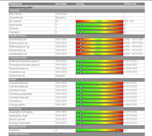 Zoals je ziet, heeft deze patiënt weinig van de hoeveelheden E. Coli, bifido etc. Op deze manier kan de darmflora zichzelf niet goed in evenwicht houden, wat schadelijke bacteriën en schimmels meer kans biedt.